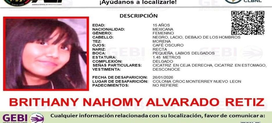 La Fiscalía General de Justicia de Nuevo León activó una Alerta Amber para localizar a Britany Nahomi Alvarado Reyes, de 15 años, quien desapareció al norte del municipio de Monterrey.
