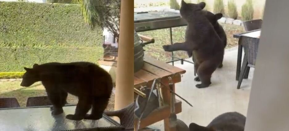 En las imágenes se observa a uno de los osos erguido sobre dos patas, muy cerca de un asador, mientras que los otros tres se encuentran alrededor de una mesa.